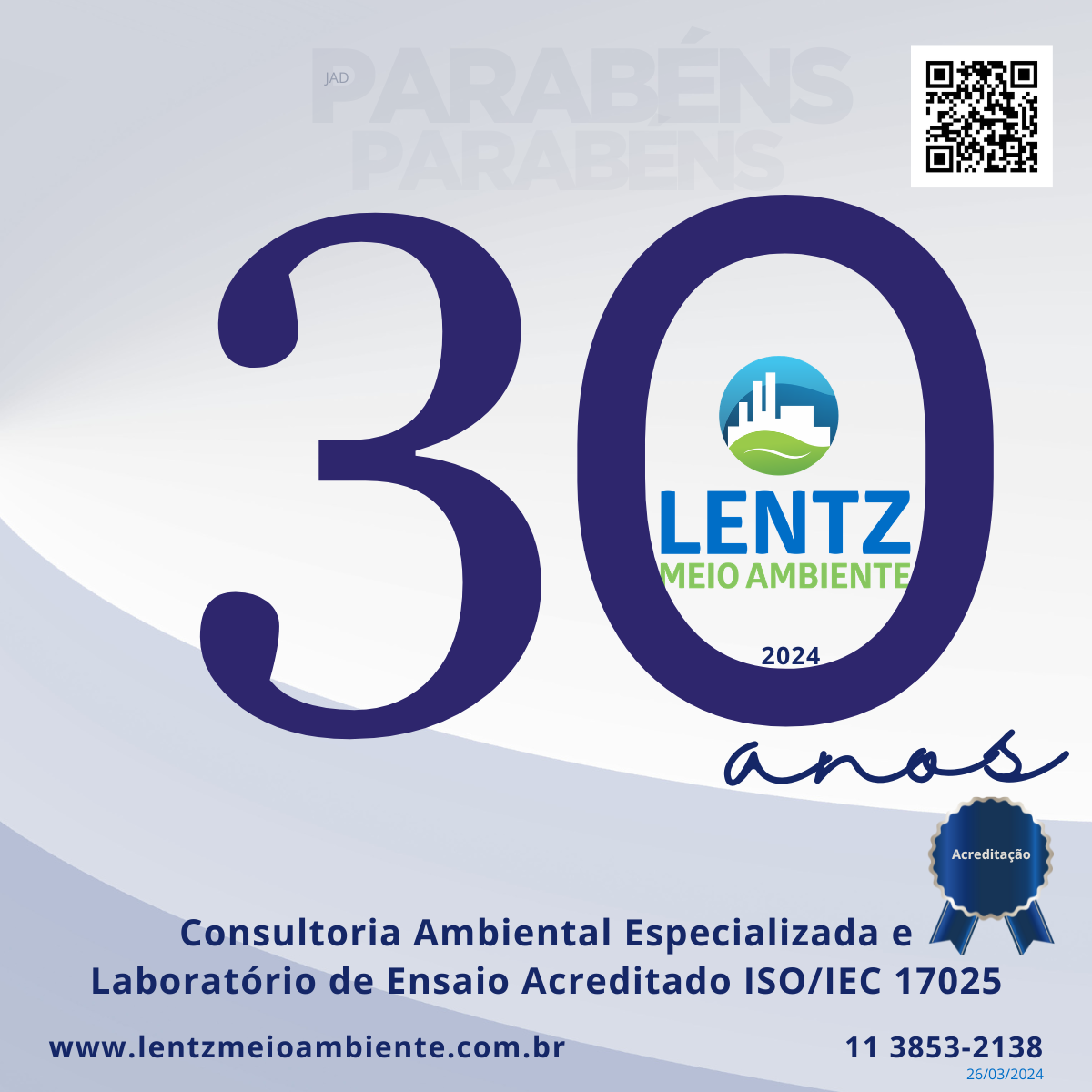 Celebrando 30 anos na Lentz Meio Ambiente! É com imenso orgulho que chegamos a este marco de três décadas de sucesso da empresa. Em 1994 iniciamos nossa trajetória dedicada a prestação de serviços dedicada a prestação de serviços de Consultoria Ambiental Especializada. Desde 2016 somos Laboratório de Ensaio Acreditado pelo Cgcre/Inmetro (CRL 1151) e a partir de 2021 no Instituto Água e Terra (IAT) do Paraná (IAT CCL nº097R). Atuamos em diversos setores no Brasil